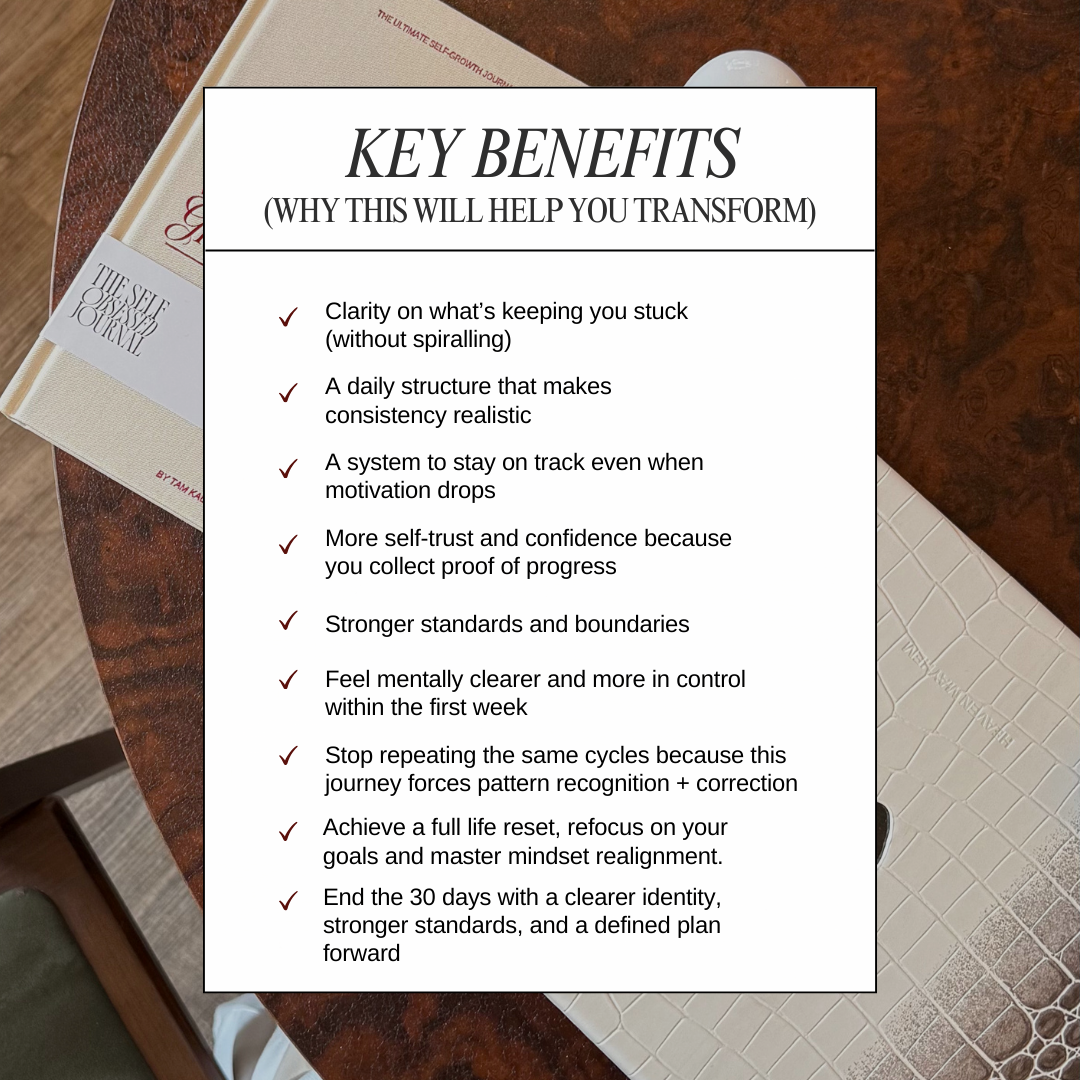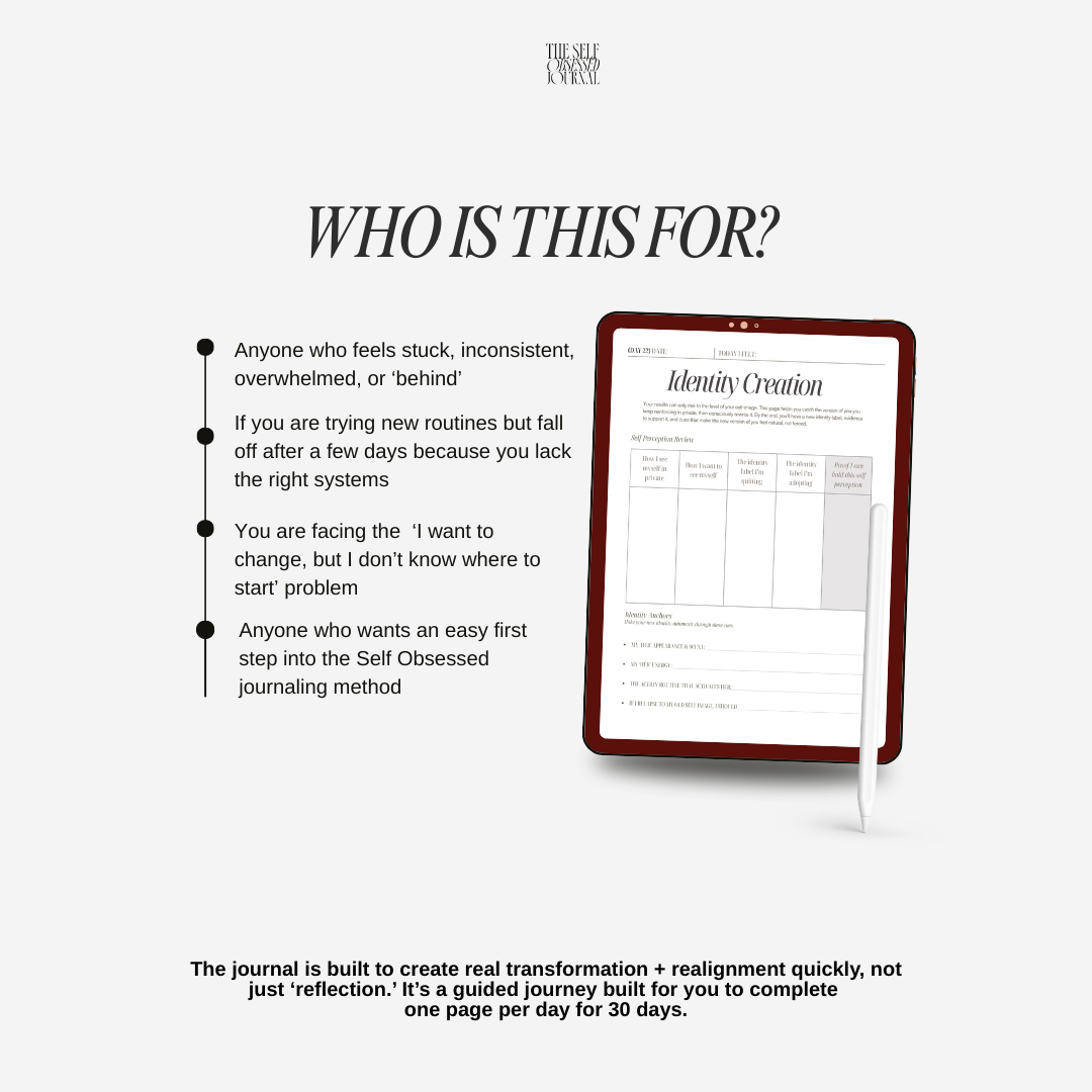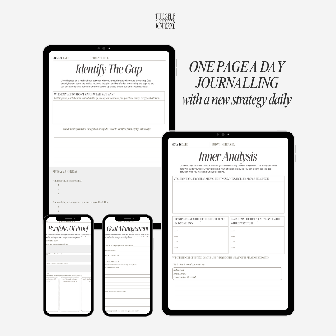Most women don’t need more motivation. They need a system that works on their worst days, not just their best ones. This guided digital journey is designed to help you transform practically through different methods each day to get you out of a slump, shift your identity and solve your limiting patterns. It’s completely separate from our physical journals, offering new, exclusive digital pages. This is the ultimate growth tool built for consistency, self-concept and emotional reality.
