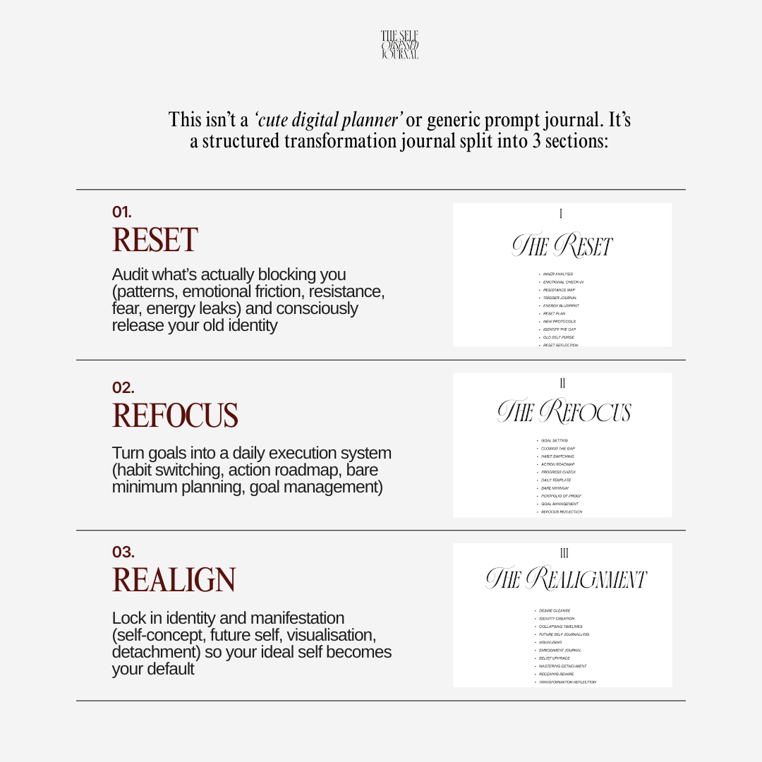 This isn’t a “cute digital planner” or generic prompt journal. It’s a structured transformation journal split into 3 sections: